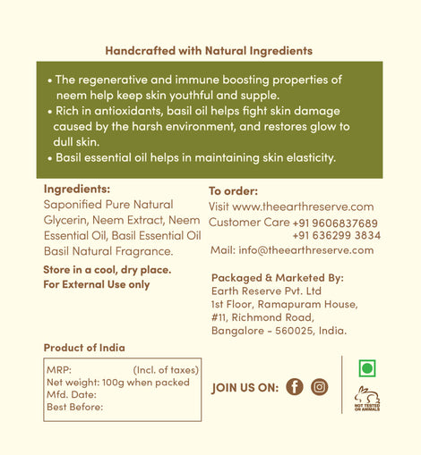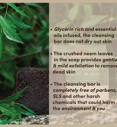 Artisanal homemade soap crafted from neem and basil. Rooted in the age-old knowledge of the ayurvedic qualities of the two plants, this fragrant soap which is one of our bestsellers, is completely natural, free from additives and synthetic enhancers.