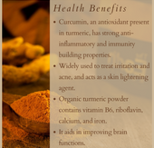 Organic haldi powder contains Vitamin B6, Niacin, Choline, and Riboflavin. It also contains numerous minerals like Calcium, Potassium, Iron, Manganese, Copper, Zinc and Magnesium.