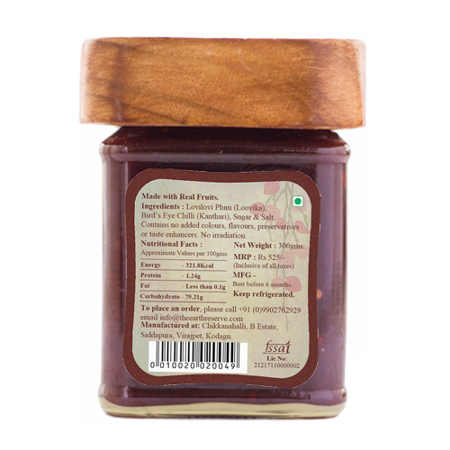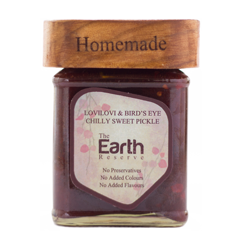 Made from Lovilovi plums and Bird’s Eye Chillies that grow wild in the coffee estates of Coorg, The Earth Reserve's Sweet pickle is a must-have for all who love the combination of sweet and spicy. One of the most piquant (hot) chillies and sun dried, cherry sized plums combine to bring you a flavour that is sweet but also has a spicy kick.