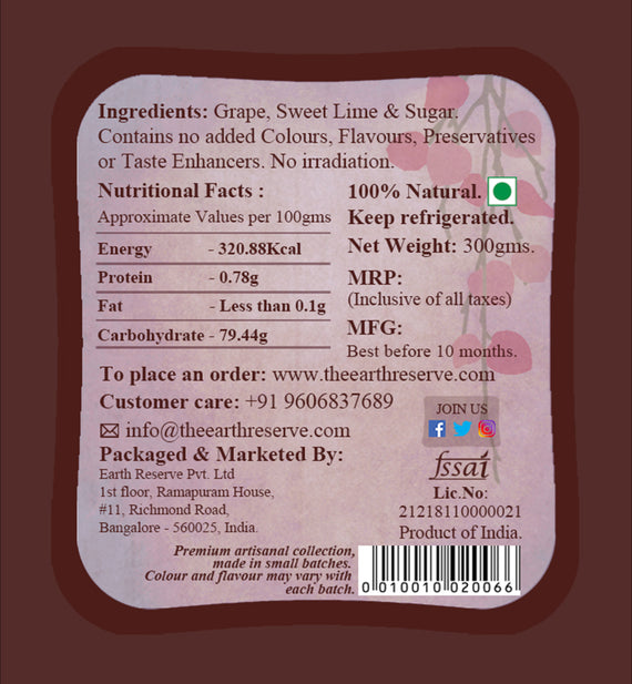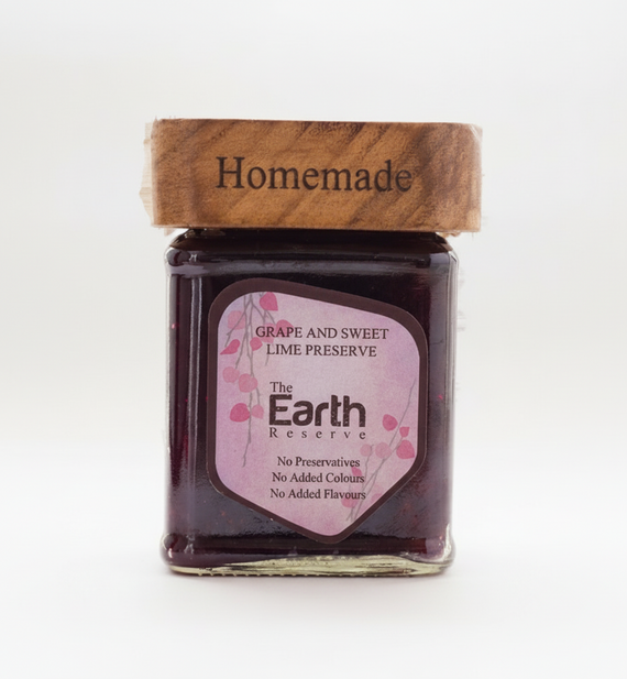 The Earth Reserve's Grape & Sweet Lime Preserve is defined by its fruity presence, thick consistency and a beautiful purple hue. The flavours and colours are all natural. This homemade wonder does not contain any added chemicals.