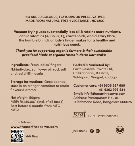 Buy Vacuum Fried Okra Crisps, where every bite is a crunchy delight straight from the heart of nature! Sourced from the lands of Sirsi in North Karnataka, our Okra Crisps are crafted with love and care on an organic certified farm, ensuring the highest quality and freshness in every batch.