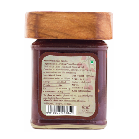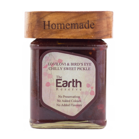 Made from Lovilovi plums and Bird’s Eye Chillies that grow wild in the coffee estates of Coorg, The Earth Reserve's Sweet pickle is a must-have for all who love the combination of sweet and spicy. One of the most piquant (hot) chillies and sun dried, cherry sized plums combine to bring you a flavour that is sweet but also has a spicy kick.