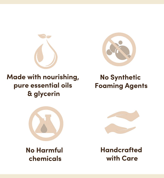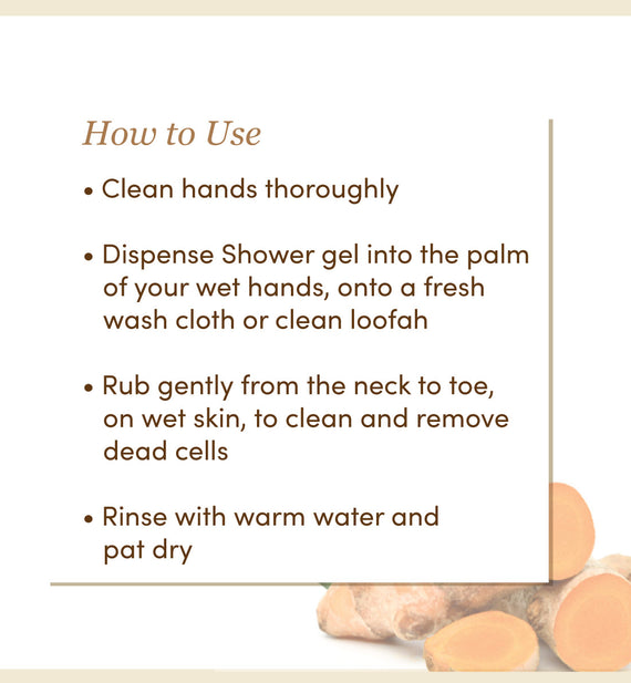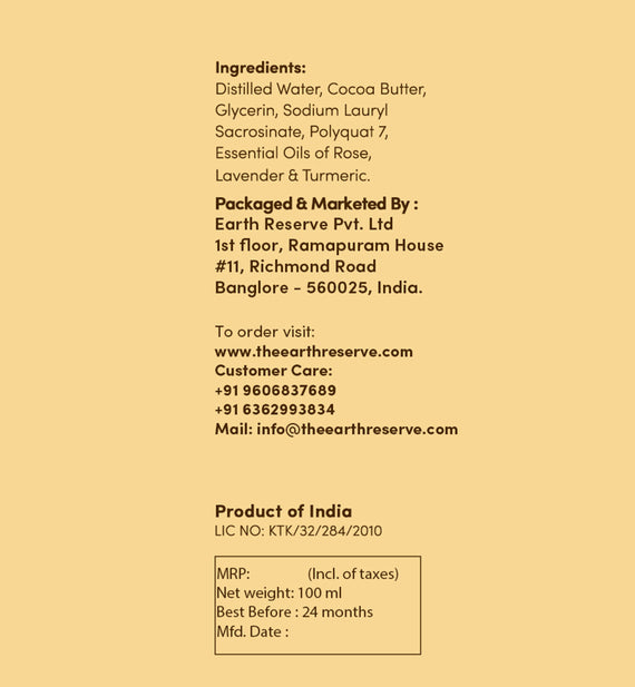 The divine goodness of turmeric, lavender and rose essential oils come together in this body wash. With the antibacterial and antiseptic qualities of turmeric, and soothing qualities of lavender, the body wash heals and replenishes skin. Enriched with cocoa butter and glycerin, it deeply moisturises and nourishes your skin.With a mild lather, it plays it nourishing role on the skin, while leaving a lingering floral scent. Handmade with utmost care, the shower gel is perfectly balanced to bring out the innate qualities of each of the ingredients.