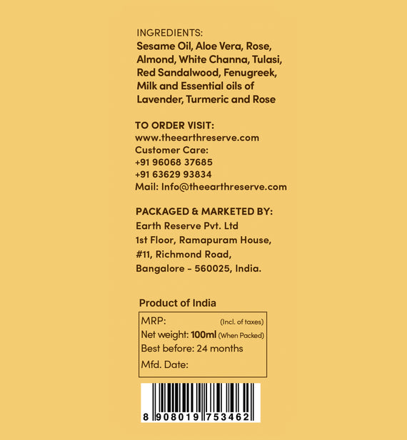 Made from oils and herbs used in Ayurveda that revitalises skin such as sesame oil, Aloevera, Almonds, Rose, Tulasi, White Channa, Fenugreek, Red Sandalwood, Essential oils of Lavender, Turmeric and Rose, Milk.
