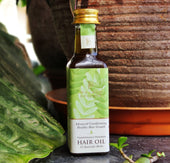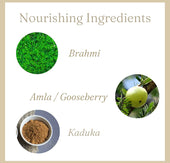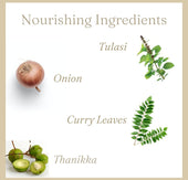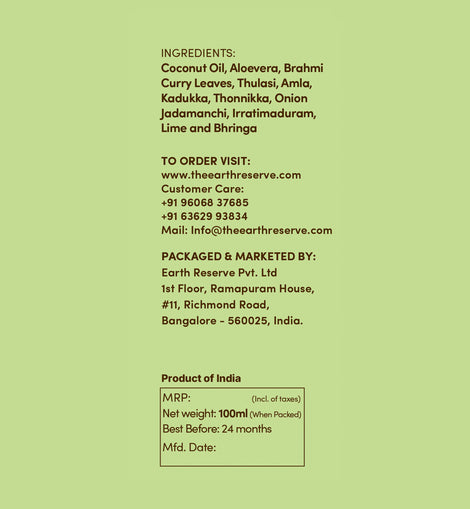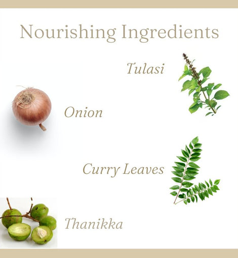 Made from oils and herbs used in Ayurveda that nourishes skin and scalp such as Coconut oil, Brahmi, Aloevera, Thulasi, Bhringa, Curry Leaves, Amla, Thanikka, Kadukka, Onion, Irratimaduram, Lime and Jadamanchi