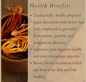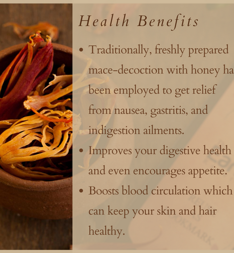 Nutmeg and nut mace are two spices from the same fruit. Nutmeg is the kernel inside the seed, whereas mace is the red threadlike covering on the seed. Traditionally, freshly prepared mace-decoction with honey has been employed to get relief from nausea, gastritis, and indigestion ailments.