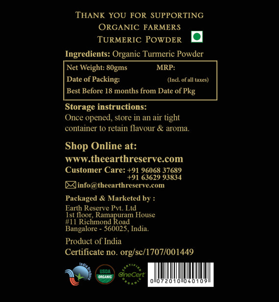 Turmeric Powder that has been known for its culinary, nutritional and medicinal benefits. The Earth Reserve’s Organic spices are free from any kind of adulteration and synthetic chemical sprays, it is grown in organic farms surrounded by the verdant forests of Uttara Kannada, Karnataka. The soil and climate there are ideal for the production of pure turmeric powder. Along with its flavor and aroma, it is packed with essential minerals and vitamins.